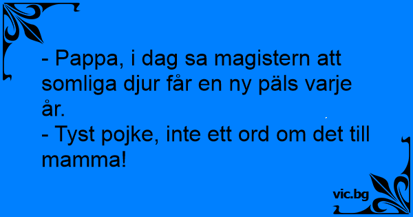 - Pappa, i dag sa magistern att somliga djur får en ny päls varje år.<br />- Tyst pojke, inte ett ord om det till mamma!