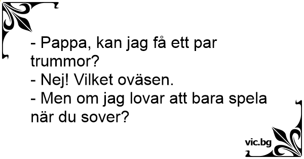 Pepíček prosí tátu: "Tati, kup mi buben." "Nekoupím, budeš mě rušit při práci." Pepíček: "Neboj, budu bubnovat jenom, když budeš spát."