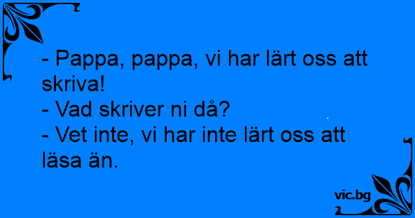 - Nå Lise hva har du lært på skolen i dag? - Å skrive. - Hva skrev du da? - Det vet jeg ikke for vi har ikke lært å lese ennå.