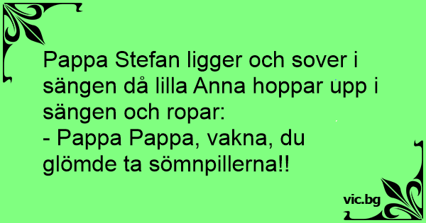 Rikard kom in till sin pappa och sa: - Pappa, pappa, vakna... Pappan vaknade och sa: - Öh,vad är det? - Du glömde ta dina sömntabletter...