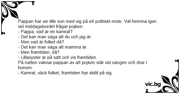 Едно дете го прашува својот татко: - Тато што е тоа политика? - Епа тоа ти е вака сине: Јас во фамилијава заработувам, значи јас сум капитализам, јас им плаќам на чистачката и дадилката значи тие...