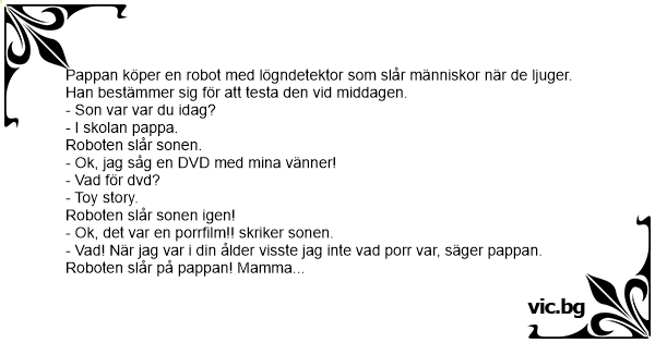 Isä ostaa valheenpaljastimella varustetun robotin, joka lyö ihmistä aina kun tämä valehtelee. Hän päättää testata robottia ruokapöydässä. - Poika, missäs olit tänään? Poika vastaa: - Koulussa...