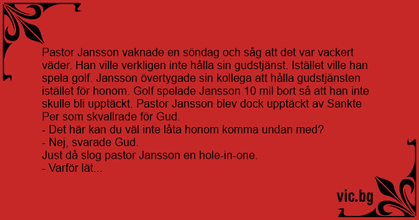 Pastor Jansson vaknade en söndag och såg att det var vackert väder. Han ville verkligen inte hålla sin gudstjänst. Istället ville han spela golf. Jansson övertygade sin kollega att hålla gudstjänsten istället för honom. Golf spelade Jansson 10 mil bort så att han inte skulle bli upptäckt. Pastor Jansson blev dock upptäckt av Sankte Per som skvallrade för Gud.