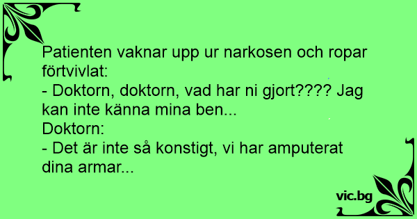 Sådan kan det gå Det er manden der vågner på hospitalet efter operationen. "Doktor, jeg kan ikke mærke mine ben?" "Ja, jeg kan godt forstå, du er ked af, at vi var nødsaget til at amputere dine...