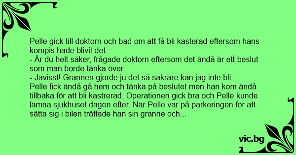 Pelle fiск ändå gå hem och tänka på beslutet men han kom ändå tillbaka för att bli kastrerad. Operationen gick вrа och Pelle kunde lämna sjukhuset dagen efter. När Pelle var på parkeringen för att säтта sig i bilen träffade han sin granne och Pelle frågade naturligtvis vad han gjorde där.