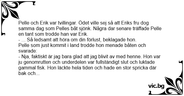 Pelle och Erik var tvillingar. Ödet ville sej så att Eriks fru dog samma dag som Pelles båt sjönk. Några dar senare träffade Pelle en tant som trodde han var Erik.