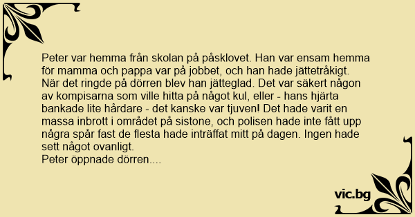 Peter var hemma från skolan på påsklovet. Han var ensam hemma för mamma och pappa var på jobbet, och han hade jättetråkigt.