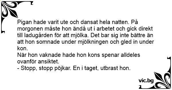 Pigan hade varit ute och dansat hela natten. På morgonen måste hon ändå ut i arbetet och gick direkt till ladugården för att mjölka. Det bar sig inte bättre än att hon somnade under mjölkningen och gled in under kon.