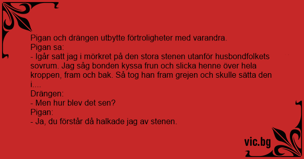 - Igår satt jag i mörkret på den stora stenen utanför husbondfolkets sovrum. Jag såg bonden kyssa frun och slicka henne över hela kroppen, fram och bak. Så tog han fram grejen och skulle säтта den i....