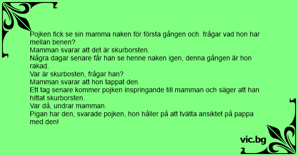 Ett tag senare kommer pojken inspringande till mamman och säger att han hittat skurborsten.