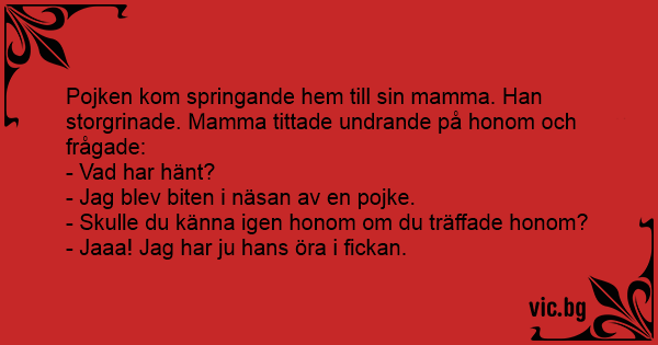 Pojken kom springande hem till sin mamma. Han storgrinade. Mamma tittade undrande på honom och frågade: