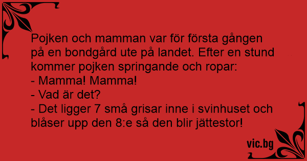 Pojken och mamman var för första gången på en bondgård ute på landet. Efter en stund kommer pojken springande och ropar: