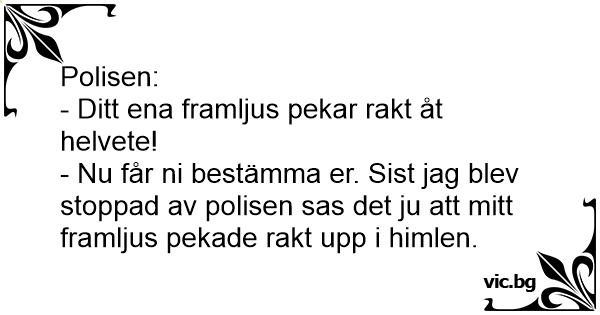 - Nu får ni bestämma er. Sist jag blev stoppad av polisen sas det ju att mitt framljus pekade rakt upp i himlen.