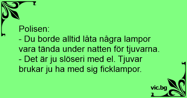 Polisen:<br />- Du borde alltid låta några lampor vara tända under natten för tjuvarna.<br />- Det är ju slöseri med el. Tjuvar brukar ju ha med sig ficklampor.