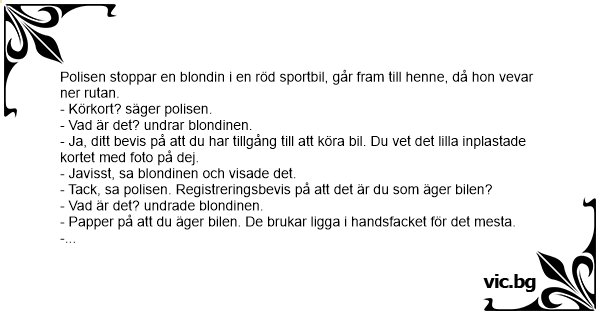 Polismannen stoppade en röd sportbil och gick fram till den för att be föraren om körkort och registreringsbevis. - Wow det var en riktigt läcker liten blondin det där, tänkte han. - Har du...