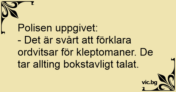 - Det är svårt att förklara ordvitsar för kleptomaner. De tar allting bokstavligt talat.