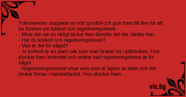 - Registreringsbeviset visar vem som är ägare av bilen och det brukar finnas i handskfacket. Hon plockar fram det och polisen går tillbaka till sin bil för att ringa och kontrollera det. Hans chef undrar om det rör sig om en ur läcker blondin i en röd sportbil, jo visst det stämmer.