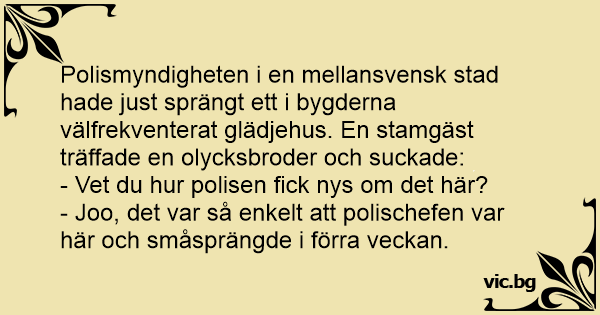 Polismyndigheten i en mellansvensk stad hade just sprängt ett i bygderna välfrekventerat glädjehus. En stamgäst träffade en olycksbroder och suckade: