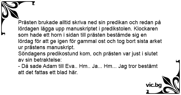 Prästen brukade alltid skriva ned sin predikan och redan på lördagen lägga upp manuskriptet i predikstolen. Klockaren som hade ett horn i sidan till prästen bestämde sig en lördag för att ge igen för gammal ost och tog bort sista arket ur prästens manuskript.