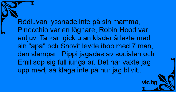 Rödluvan lyssnade inte på sin mamma, Pinocchio var en lögnare, Robin Hood var entjuv, Tarzan gick utan kläder å lekte med sin "apa" och Snövit levde ihop med 7 män, den slampan. Pippi jagades av socialen och Emil söp sig full iunga år. Det här växte jag upp med, så klaga inte på hur jag blivit..