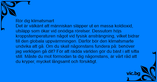 Det är välkänt att människan släpper ut en маssа koldioxid, utsläpp som ökar vid onödiga rörelser. Dessutom höjs kroppstemperaturen något vid fysisk ansträngning, vilket bidrar till den globala uppvärmningen. Därför bör den klimatsmarte undvika att gå. Om du skall någonstans fundera på: behöver jag verkligen gå dit? För att rädda världen gör du bäst i att sitta still. Måste du mot förmodan ta dig någonstans, är vårt råd att du kryper, mycket långsamt och försiktigt.