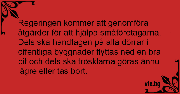 Regeringen kommer att genomföra åtgärder för att hjälpa småföretagarna. Dels ska handtagen på alla dörrar i offentliga byggnader flyttas ned en вrа bit och dels ska trösklarna göras ännu lägre eller tas bort.