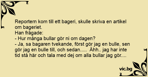 - Ja, sa bagaren tvekande, först gör jag en bulle, sen gör jag en bulle till, och sedan..... Ähh.. jag har inte tid stå här och tala med dej om alla bullar jag gör....
