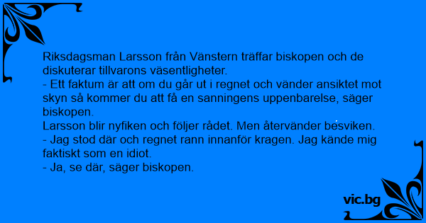 Riksdagsman Larsson från Vänstern träffar biskopen och de diskuterar tillvarons väsentligheter. - Ett faktum är att om du går ut i regnet och vänder ansiktet mot skyn så kommer du att få en sanningens uppenbarelse, säger biskopen. Larsson blir nyfiken och följer rådet. Men återvänder besviken. - Jag stod där och regnet rann innanför kragen. Jag kände mig faktiskt som en idiот. - Ja, se där, säger biskopen.