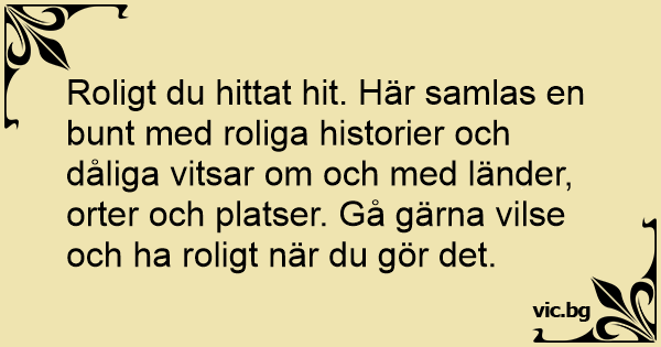Roligt du hittat hit. Här samlas en bunt med roliga historier och dåliga vitsar om och med länder, orter och platser. Gå gärna vilse och ha roligt när du gör det.