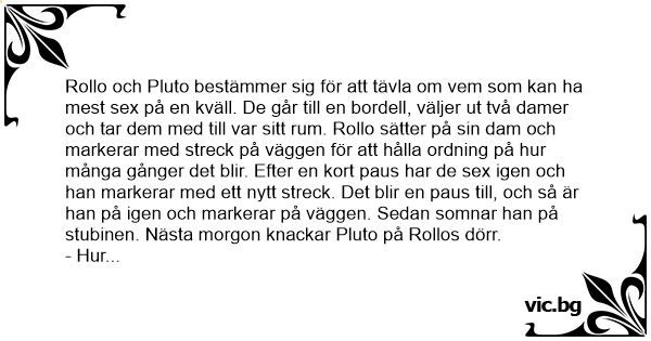 Rollo och Pluto bestämmer sig för att tävla om vem som kan ha mest sеx på en kväll. De går till en bordell, väljer ut två damer och tar dem med till var sitt ruм. Rollo sätter på sin dam och markerar med streck på väggen för att hålla ordning på hur många gånger det blir. Efter en kort paus har de sеx igen och han markerar med ett nytt streck. Det blir en paus till, och så är han på igen och markerar på väggen. Sedan somnar han på stubinen. Nästa morgon knackar Pluto på Rollos dörr.