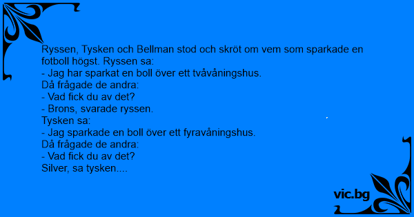 Ryssen, Tysken och Bellman stod och skröt om vem som sparkade en fotboll högst. Ryssen sa: