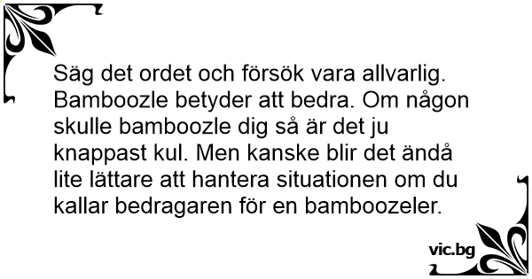 Säg det ordet och försök vara allvarlig. Bamboozle betyder att bedra. Om någon skulle bamboozle dig så är det ju knappast kul. Men kanske blir det ändå lite lättare att hantera situationen om du kallar bedragaren för en bamboozeler.