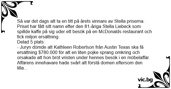 Så var det dags att ta en тiтт på årets vinnare av Stella priserna. Priset har fått sitt namn efter den 81-åriga Stella Liebeck som spillde kaffe på sig uder ett besök på en McDonalds restaurant och fiск miljon ersättning.