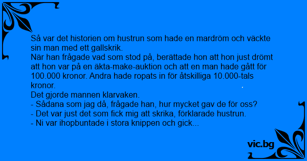 När han frågade vad som stod på, berättade hon att hon just drömt att hon var på en äkta-make-auktion och att en man hade gått för 100.000 kronor. Andra hade ropats in för åtskilliga 10.000-tals kronor.