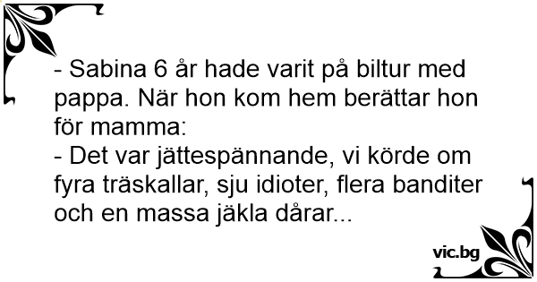 - Sabina 6 år hade varit på biltur med pappa. När hon kom hem berättar hon för mamma: