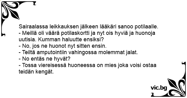 Manden vågner op på hospitalet. Lægen siger, jeg har en god og en dårlig nyhed, hvilken en vil du have først. Stik mig den dårlige, siger manden. Den dårlige er, at vi var nødt til at amputere...