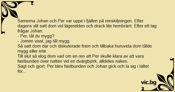 Samerna Johan och Per var uppe i fjällen på renskiljningen. Efter dagens slit satt dom vid lägerelden och drack lite hembränt. Efter ett tag frågar Johan: