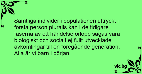 Samtliga individer i populationen uttryckt i första person pluralis kan i de tidigare faserna av ett händelseförlopp sägas vara biologiskt och socialt ej fullt utvecklade avkomlingar till en föregående generation.