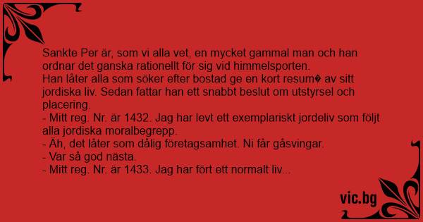 Sankte Per är, som vi alla vet, en mycket gammal man och han ordnar det ganska rationellt för sig vid himmelsporten.