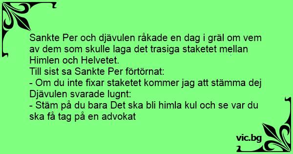 Sankte Per och djävulen råkade en dag i gräl om vem av dem som skulle laga det trasiga staketet mellan Himlen och Helvetet.