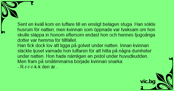 Han fiск dock lov att ligga på golvet under natten. Innan kvinnan släckte ljuset varnade hon luffaren för att hitta på några dumheter under natten. Hon hade nämligen en pistol under huvudkudden.
