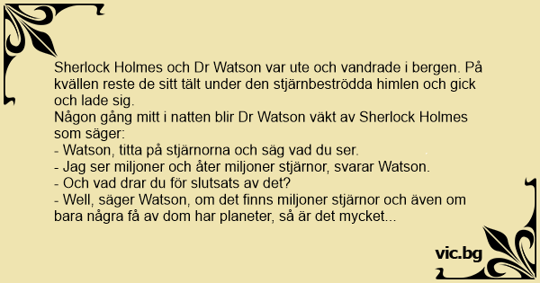Sherlock Holmes og Dr. Watson var på telttur. En kveld lå de og tittet opp på himmelen. Holmes sa: - Watson, hva ser du? - Vel, jeg ser tusener av stjerner. - Og hva betyr det for deg? - Det betyr...