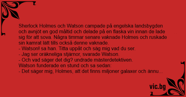Sherlock Holmes og Dr. Watson var på telttur. En kveld lå de og tittet opp på himmelen. Holmes sa: - Watson, hva ser du? - Vel, jeg ser tusener av stjerner. - Og hva betyr det for deg? - Det betyr...
