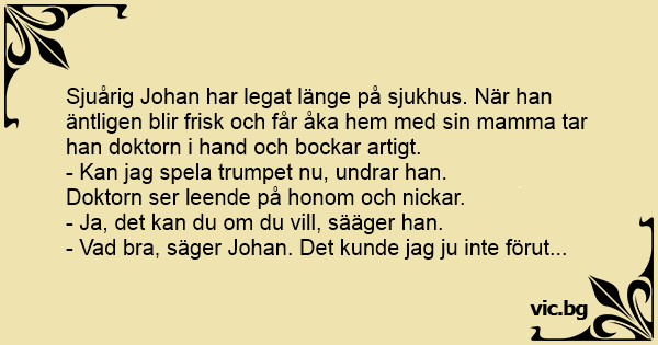 Sjuårig Johan har legat länge på sjukhus. När han äntligen blir frisk och får åka hem med sin mamma tar han doktorn i hand och bockar artigt.