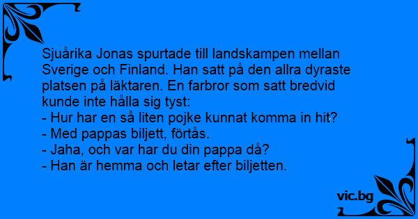 Bij een zeer belangrijke voetbalwedstrijd stapt een jongetje van een acht het stadion binnen met zijn kaartje voor de VIP-tribune. De controleur kijkt hem verbaasd aan en zegt: "Zo zo, jongeman dat...