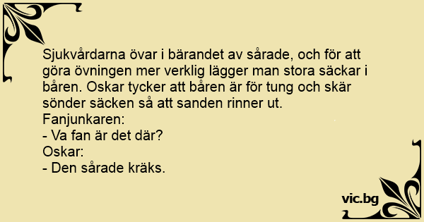 Sjukvårdarna övar i bärandet av sårade, och för att göra övningen mer verklig lägger man stora säckar i båren. Oskar tycker att båren är för tung och skär sönder säcken så att sanden rinner ut.