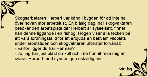 Skogsarbetaren Herbert var känd i bygden för att inte ha över hövan stor arbetslust. En blåsig dag, när skogvaktaren besöker den arbetsplats där Herbert är sysselsatt, finner han denne liggande i en rishög. Högen visar alla tecken på att vara iordningställd för att erbjuda en bekväm viloplats under arbetstiden och skogvaktaren utbrister förvånat: