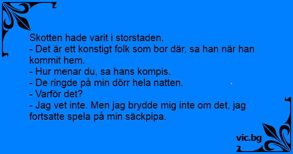 En ung skotte flyttede hjemmefra og ind i sin egen lejlighed. Et par uger senere ringere hans forældre for at høre, hvordan det gik. "Har du så fået nogen flinke naboer?" spurgte hans mor. "De er...