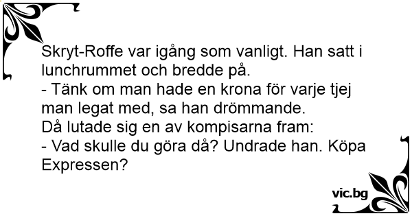 - Tänk om man hade en krona för varje tjej man legat med, sa han drömmande.