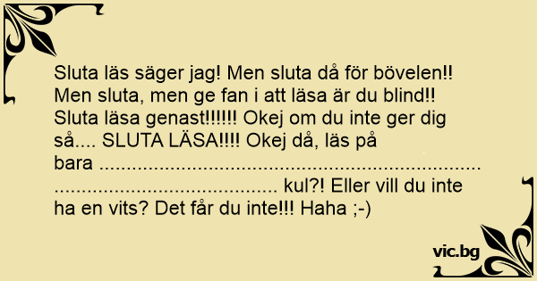 Sluta läs säger jag! Men sluta då för bövelen!! Men sluta, men ge fаn i att läsa är du blind!! Sluta läsa genast!!!!!! Okej om du inte ger dig så.... SLUTA LÄSA!!!! Okej då, läs på bara ............................................................................................................... kul?! Eller vill du inte ha en vits? Det får du inte!!! Haha ;-)